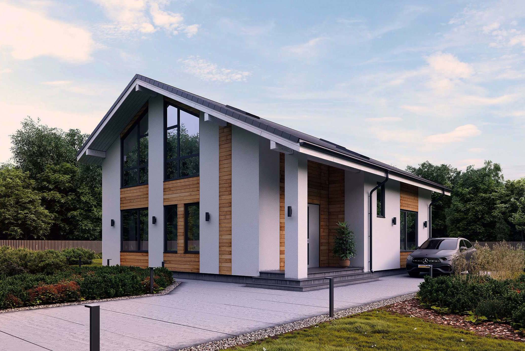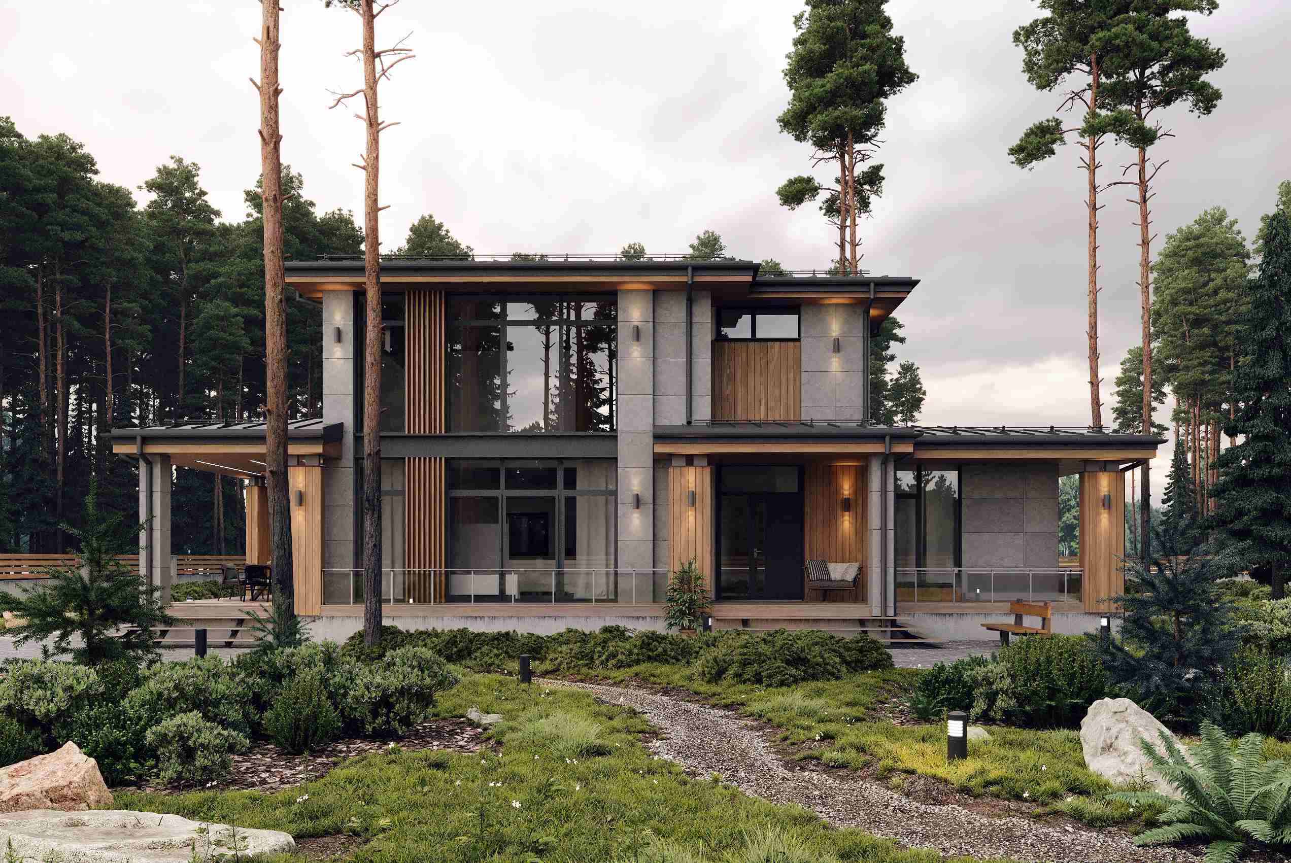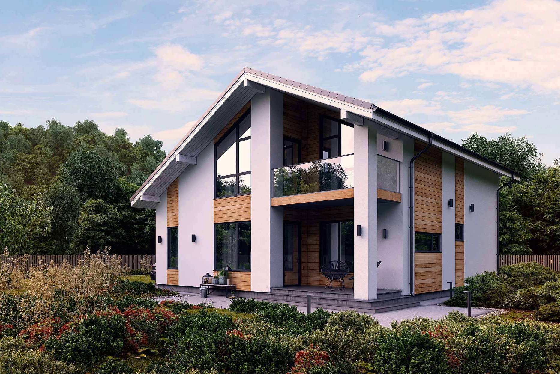 Дом в современном скандинавском стиле 209 кв.м. В этом проекте прослеживаются две основные идеи. Во первых — это легкость и органичность в архитектуре. Она достигается за счёт светлых фасадов, панорамного остекления и использования дерева в отделке. Во вторых — это гармония в пропорциях дома. Соотношение ширины к высоте дома и расположение конька кровли продумано по принципу «золотого сечения».