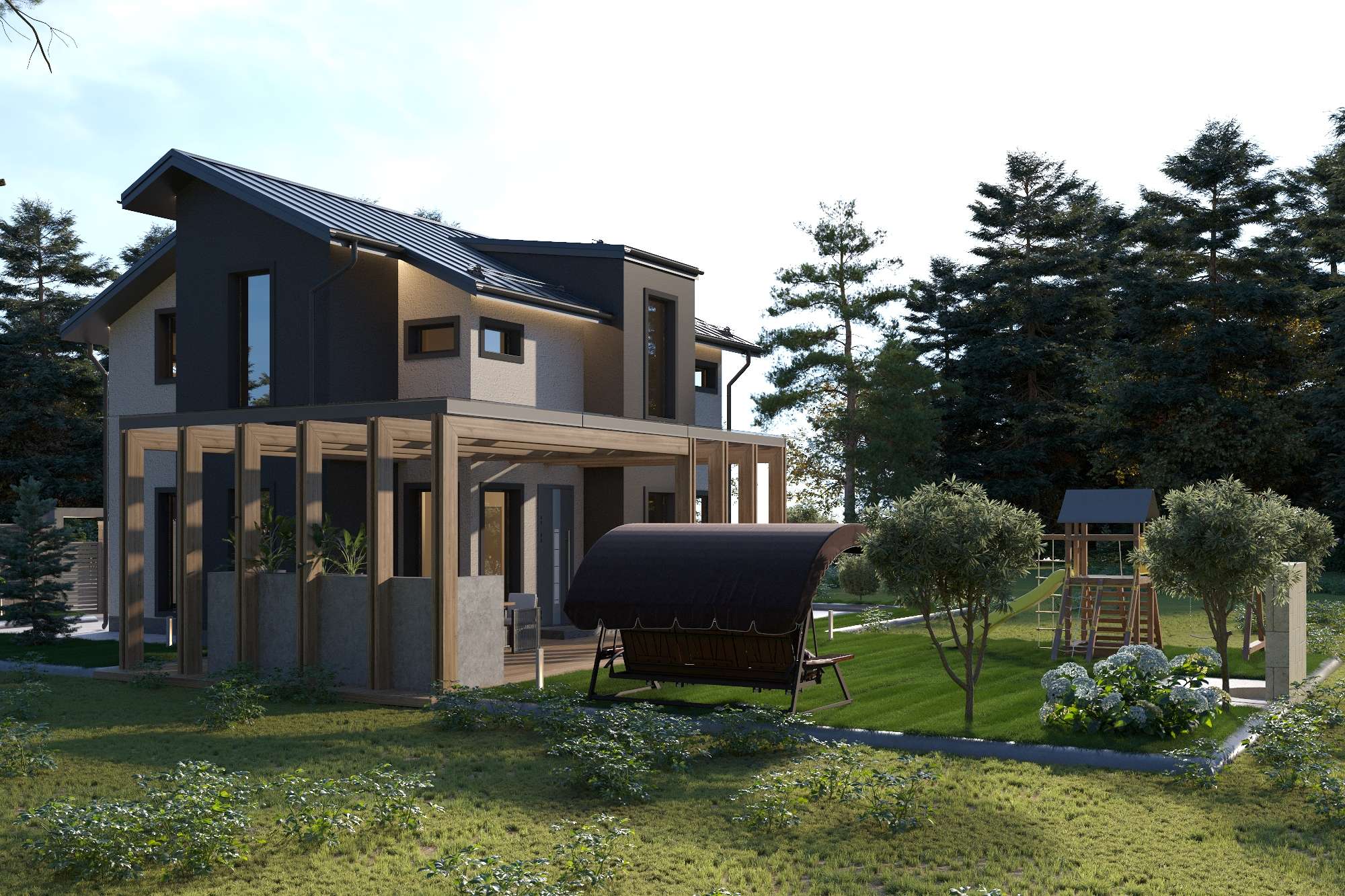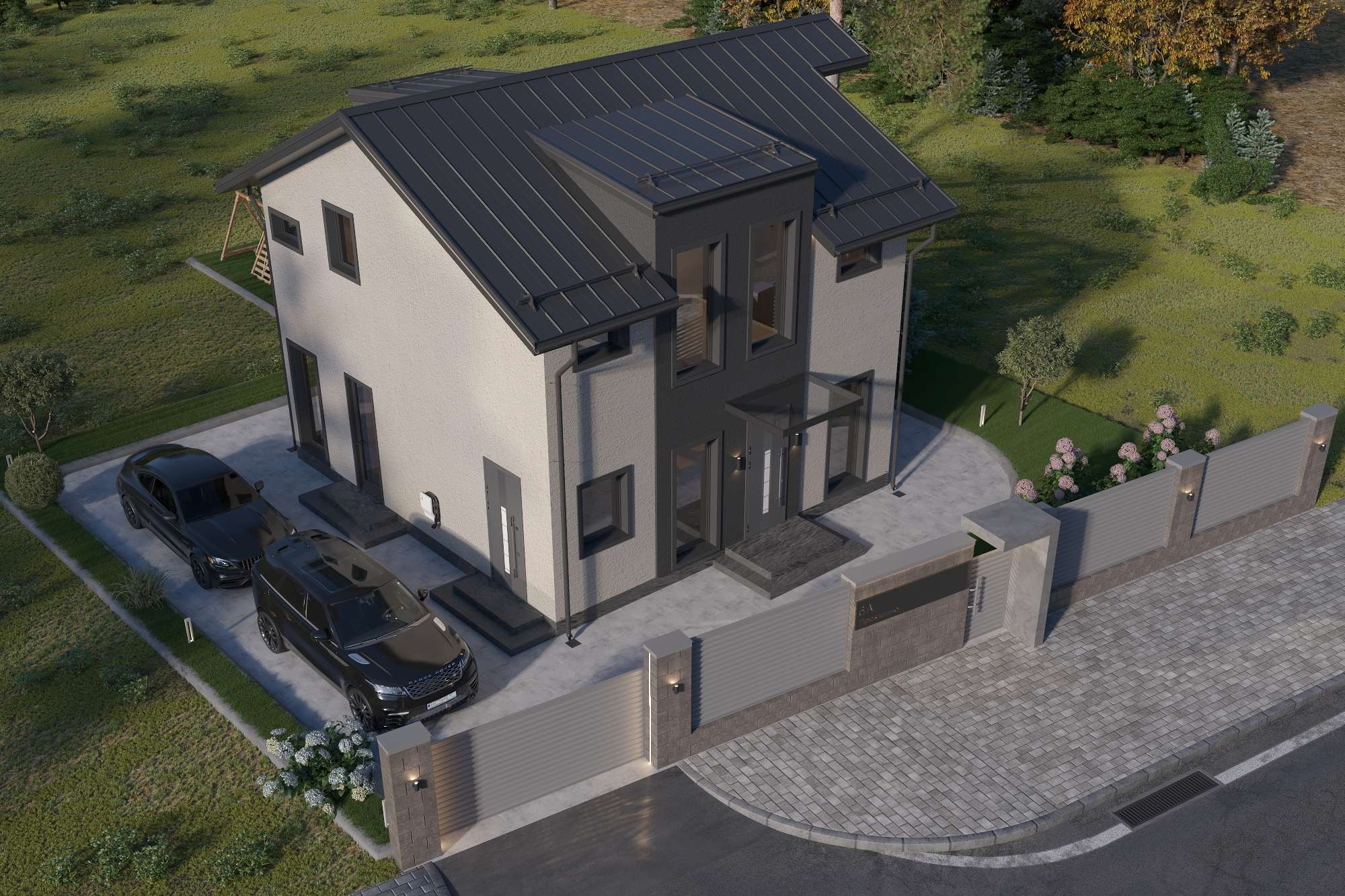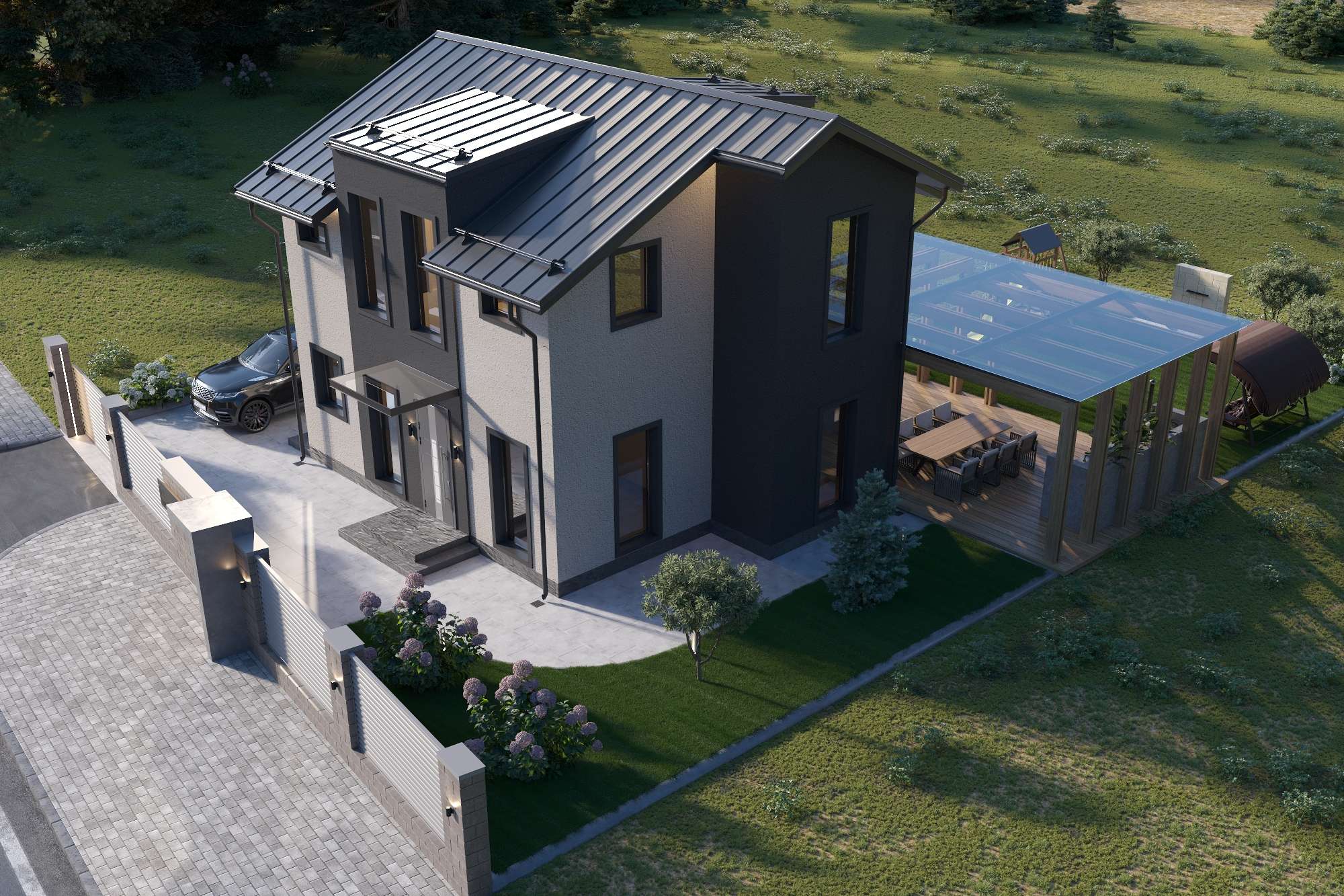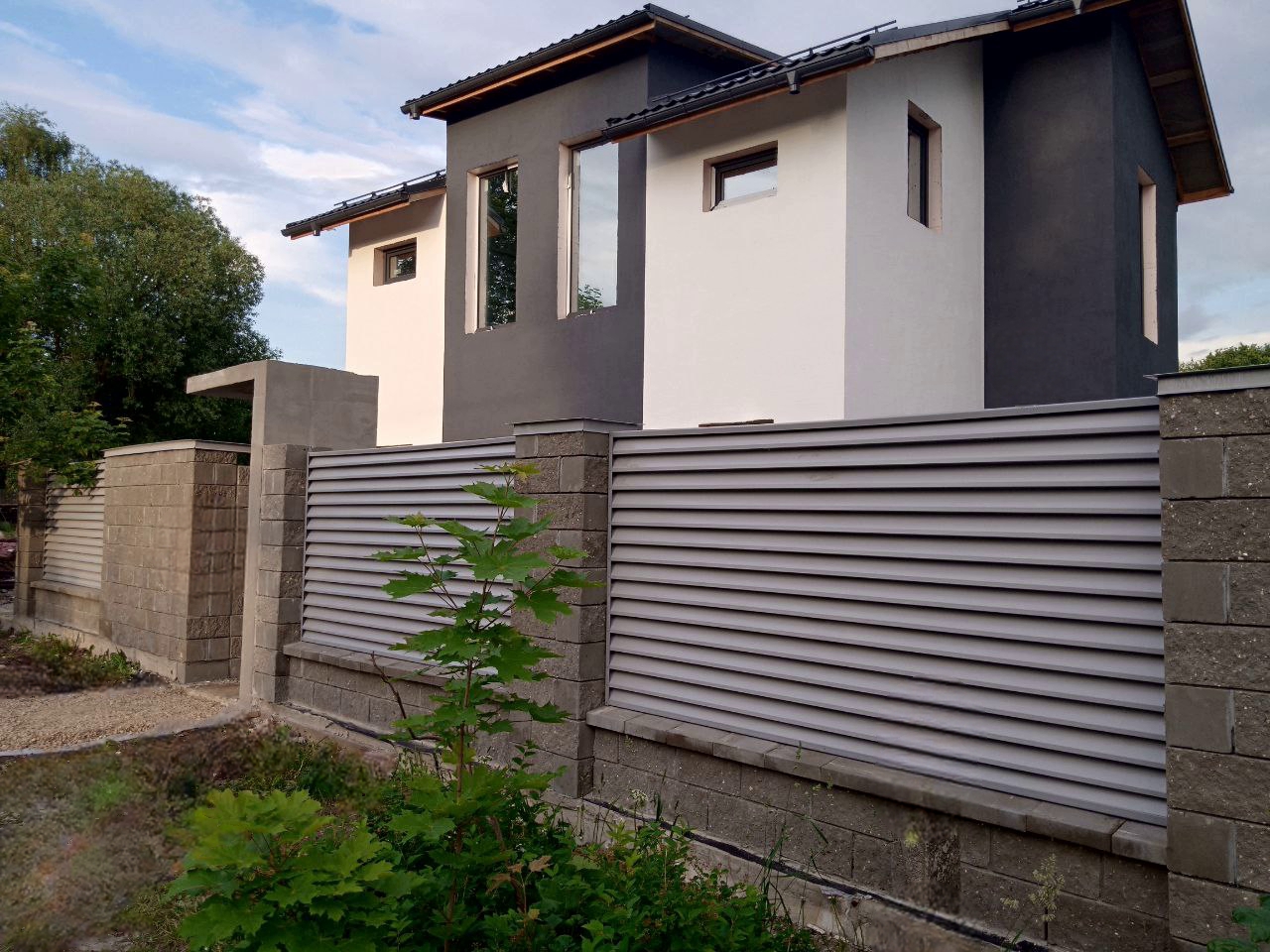 Внешние откосы и обрамление окон: 3D рамой выполнены из металлопрофиля цвет графит;