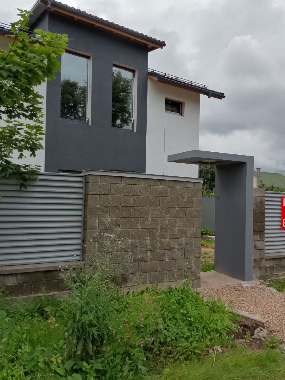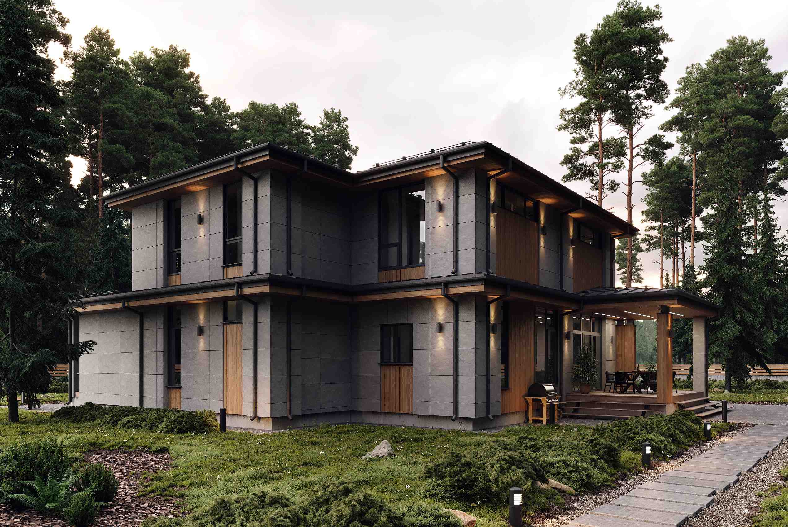 Фасад: утепление ПП 50мм + фиброцементные панели цвет серый (бетон) + вертикальная декоративная доска;