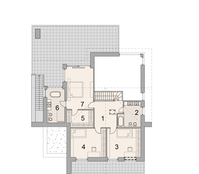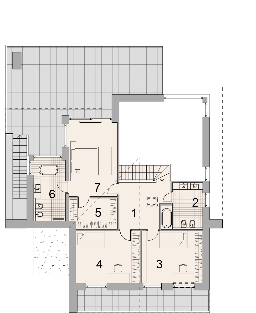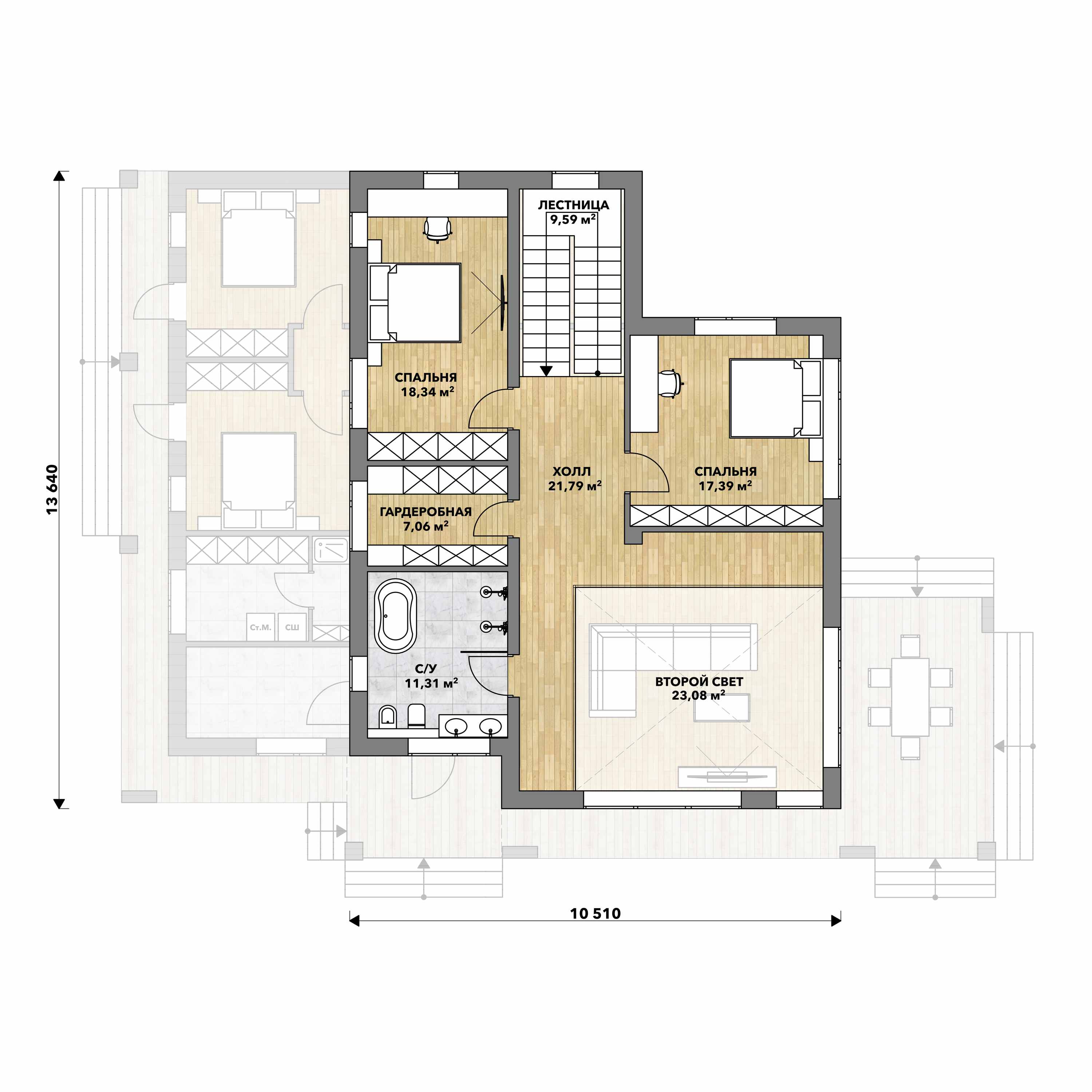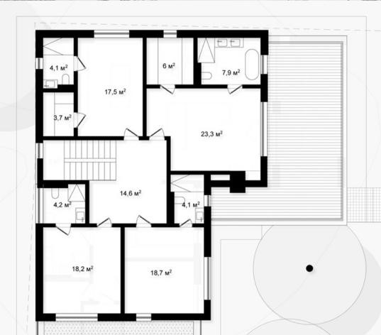 Мастер-спальня 1 - 23,3 кв.м. + гардеробная – 6 кв.м. + санузел – 7.9 кв.м. + терраса 30 кв.м.
