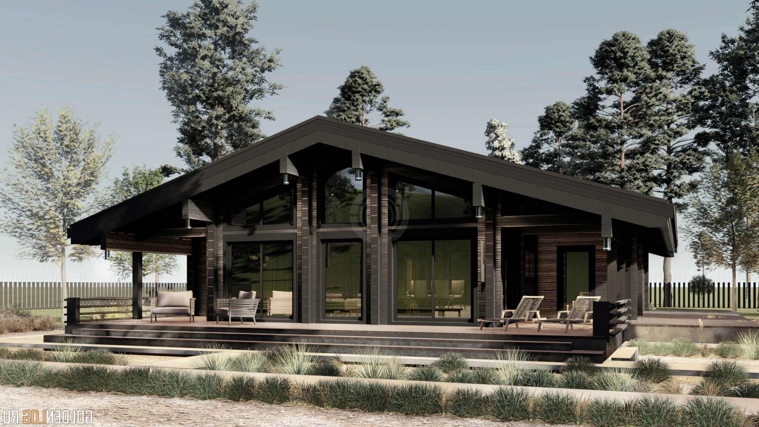 Одноэтажный дом в стиле Шале 224 кв.м. Стиль этого дома можно определить как современный шале за счет большого количества панорамных окон. В плане прослеживается основная планировочная ось, а сам дом состоит из нескольких функциональных блоков, которые формируют пространство большой кухни-гостиной с выходом на видовую террасу и отдельным кабинетом, и зону отдыха со вспомогательными помещениями. |