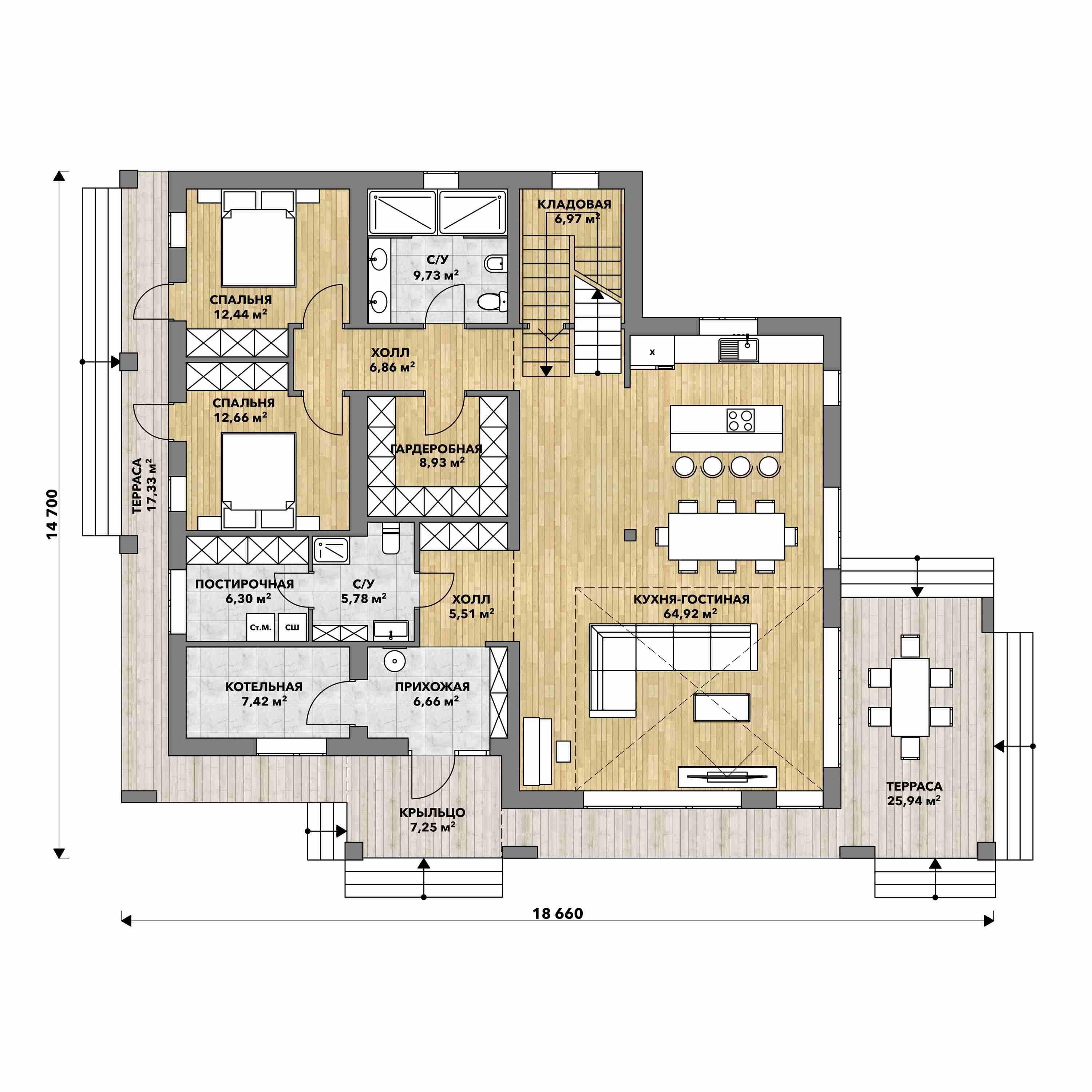 На первом этаже расположились, просторная гостиная с выходом на террасу и отдельной зоной для кухни. Гостевая спальня (или кабинет), санузел и холл из которого можно попасть в постирочную и прихожую. Так же на первом этаже расположена котельная и предусмотрена дополнительная кладовая в подлестничном пространстве.