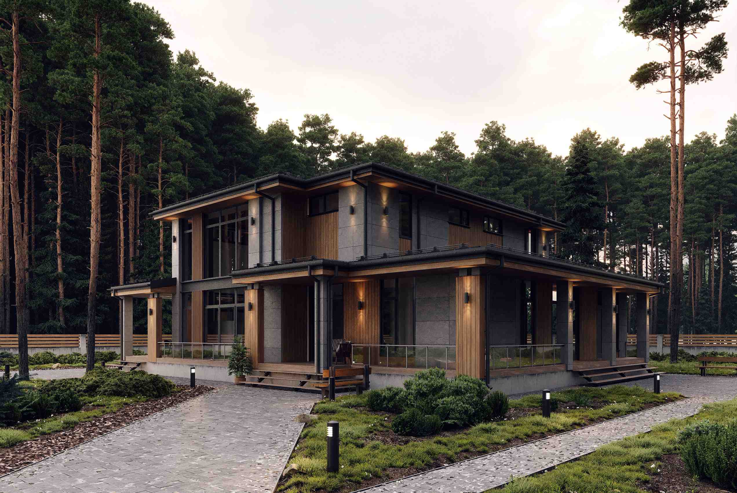 Двухэтажный дом 319 кв.м. Двухэтажный дом площадью 319 кв.м. с панорамным остеклением, в современном Европейском стиле отдаленно напоминающим стиль Лофт. Хотя проект и двухэтажный, но площадь первого этажа значительно больше второго. Из-за этого геометрия дома выглядит интереснее и сложнее. Основная идея этого дома, была сделать отдельную жилую площадь на первом этаже. В результате получилась независимая зона с двумя спальнями с собственным санузлом, гардеробной и даже выходом на участок.