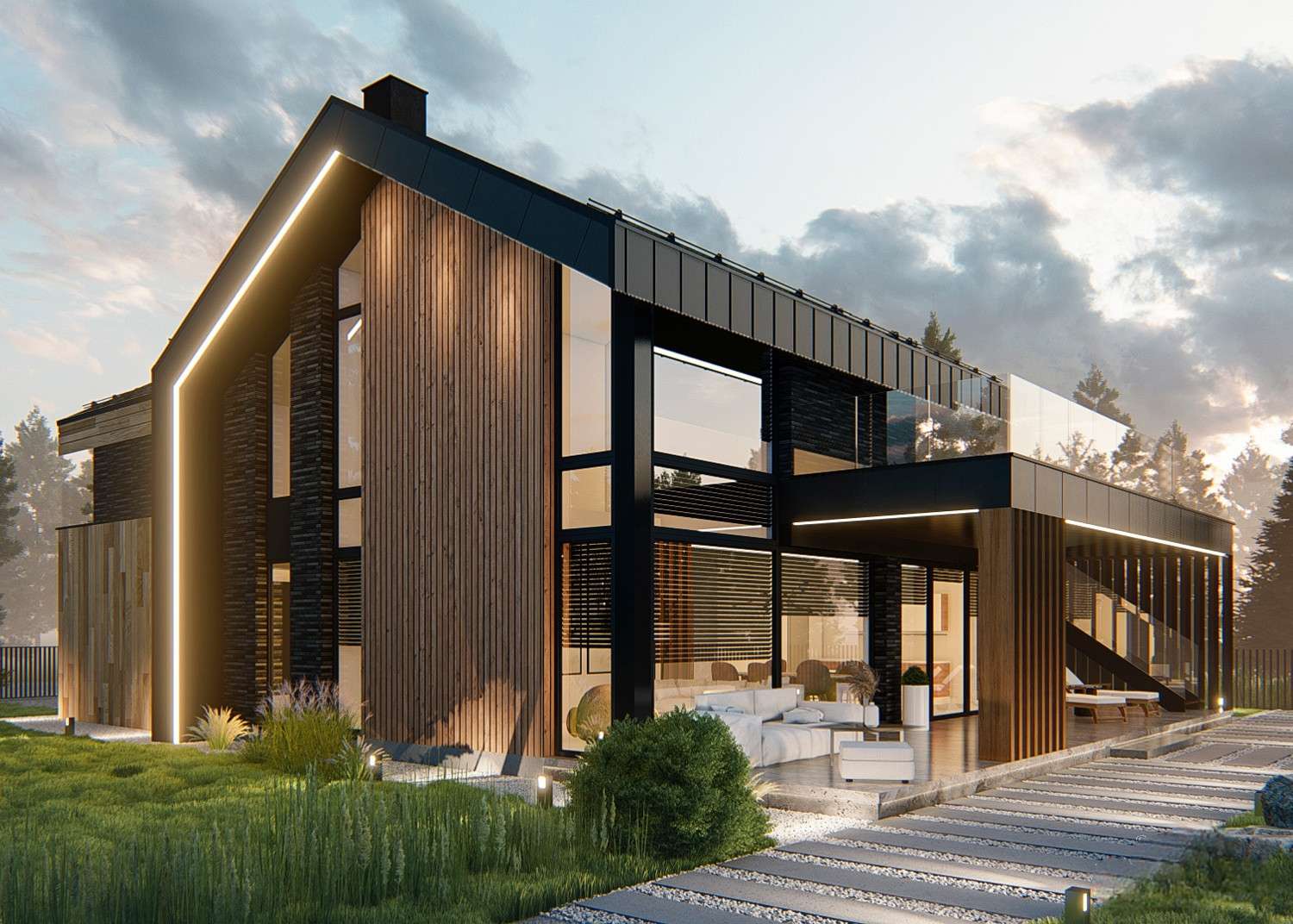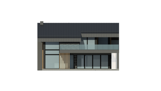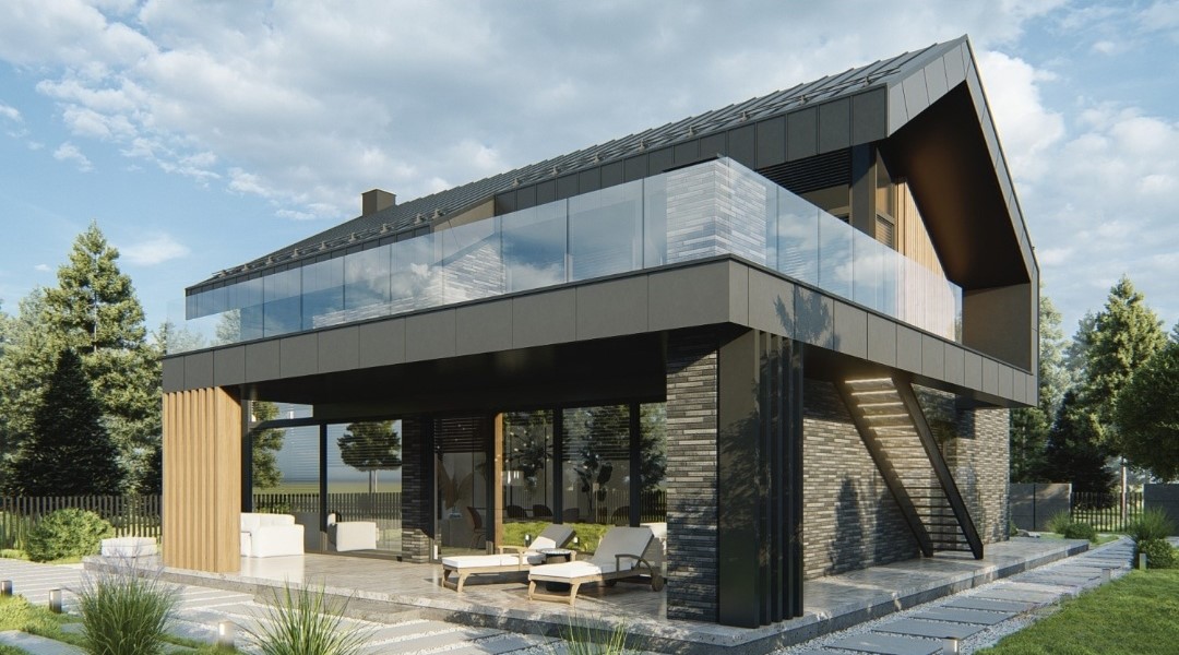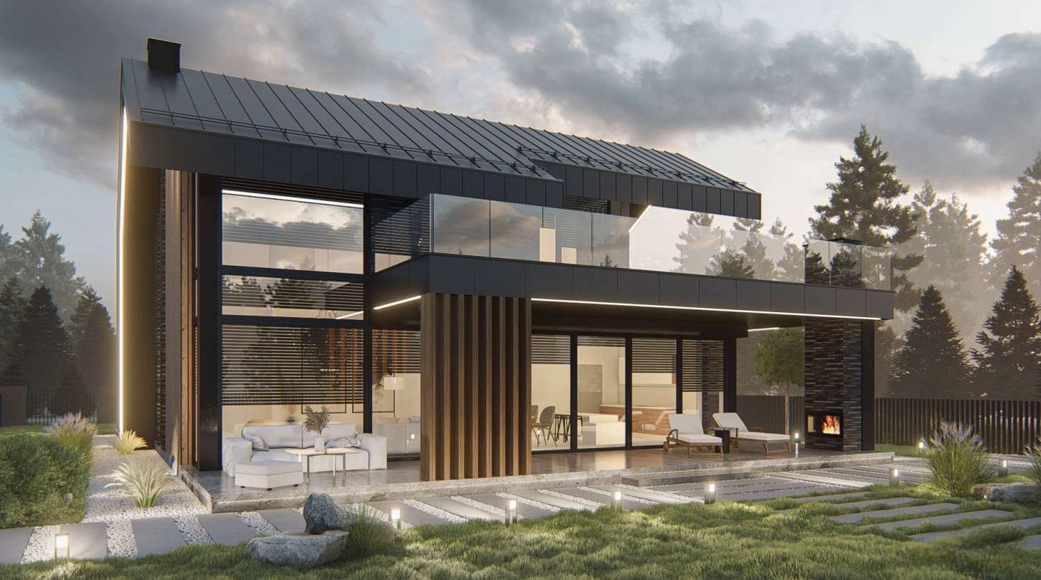 Дом выглядит стильным и современным благодаря панорамному остеклению, фальцевой кровле, а также фиброцементным панелям и вертикальной декоративной доске на фасадах.