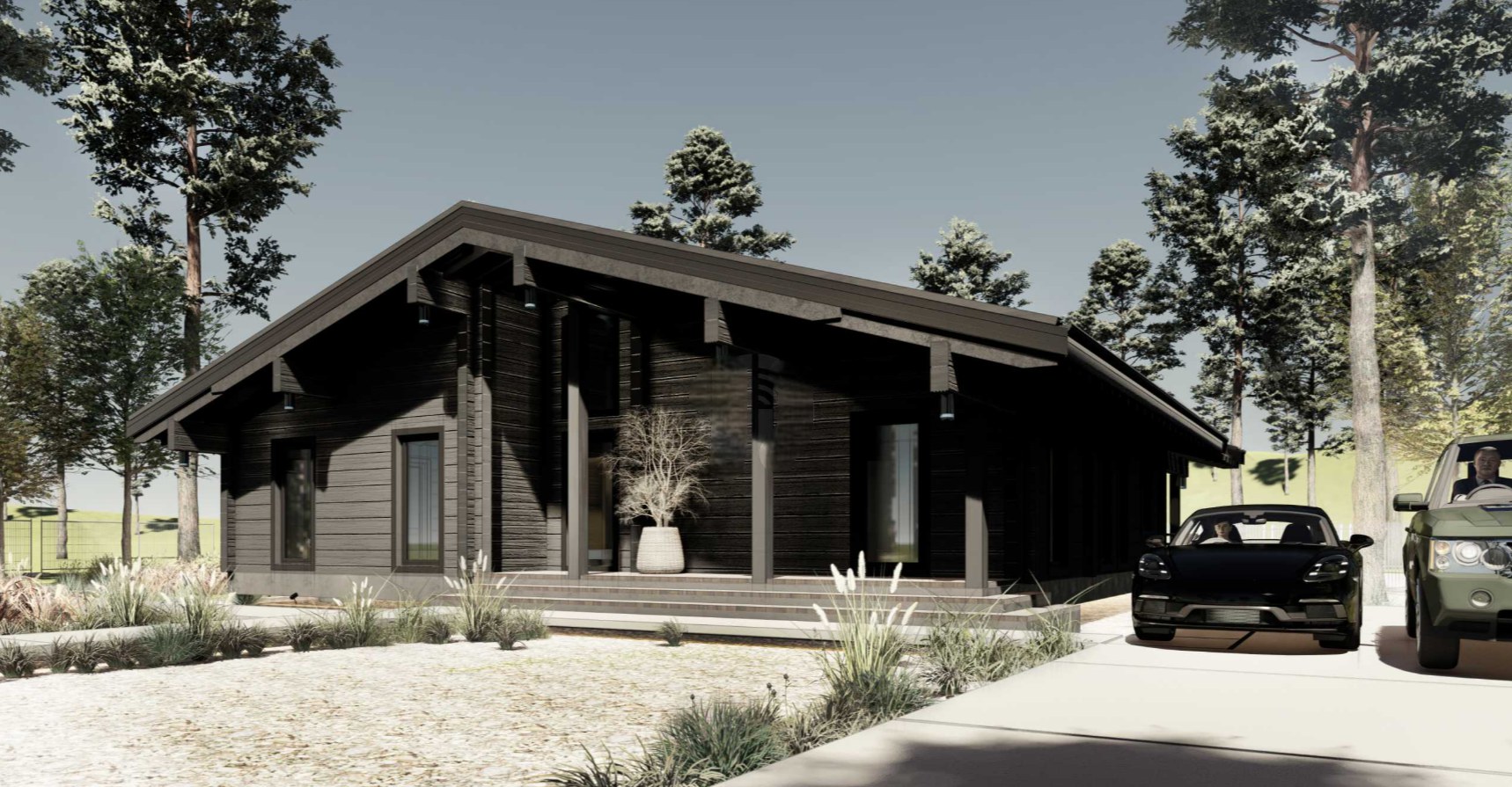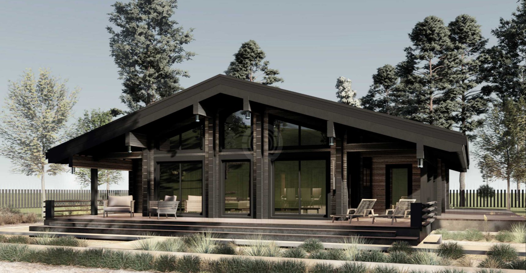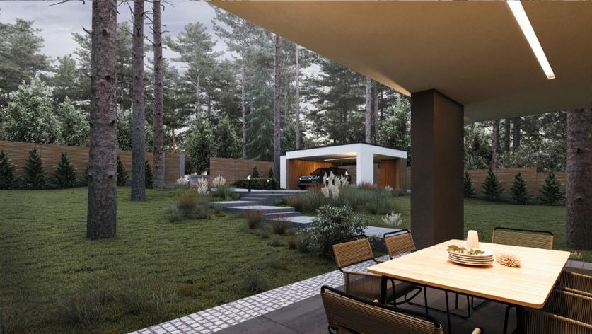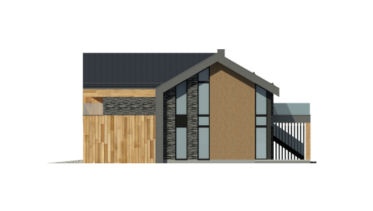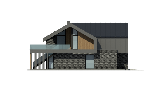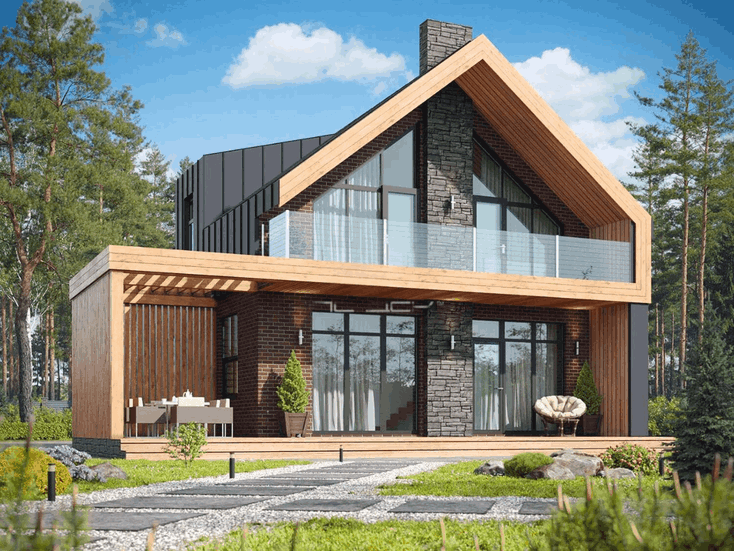 Дом выглядит стильным и современным благодаря панорамному остеклению, фальцевой кровле, а также фиброцементным панелям и вертикальной декоративной доске на фасадах.