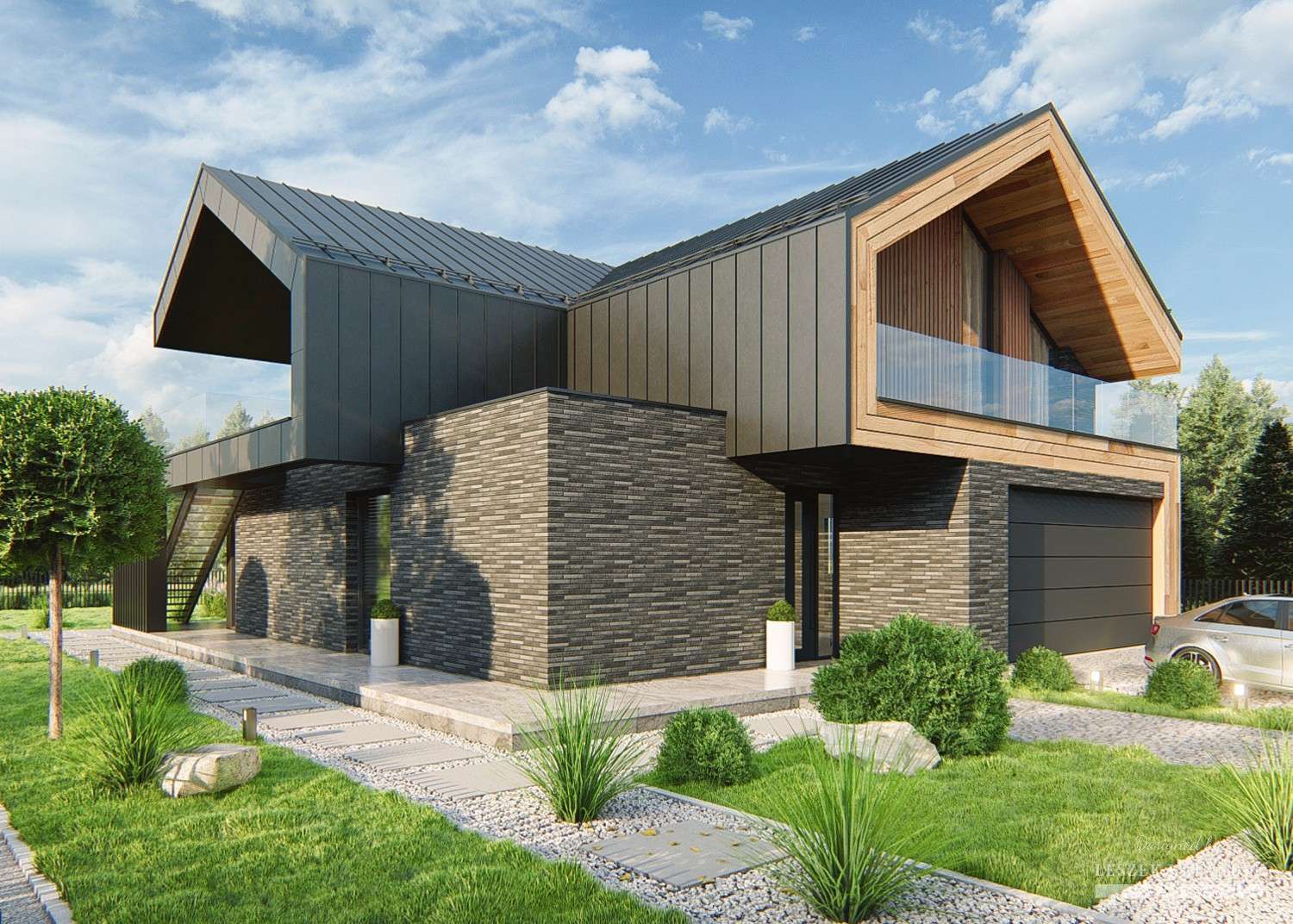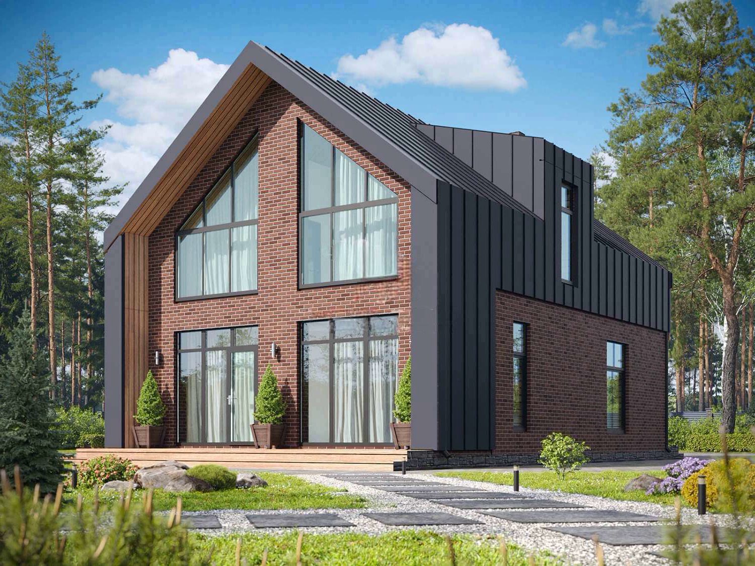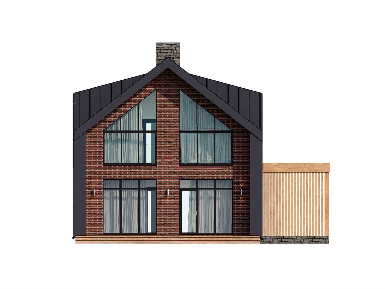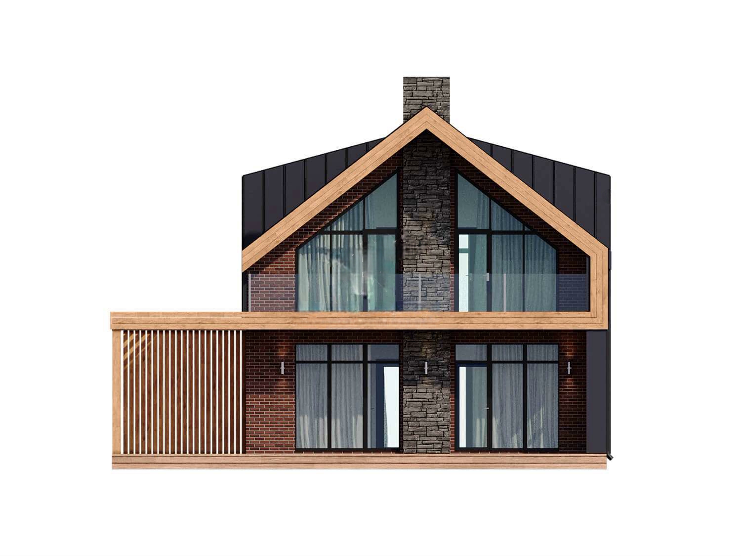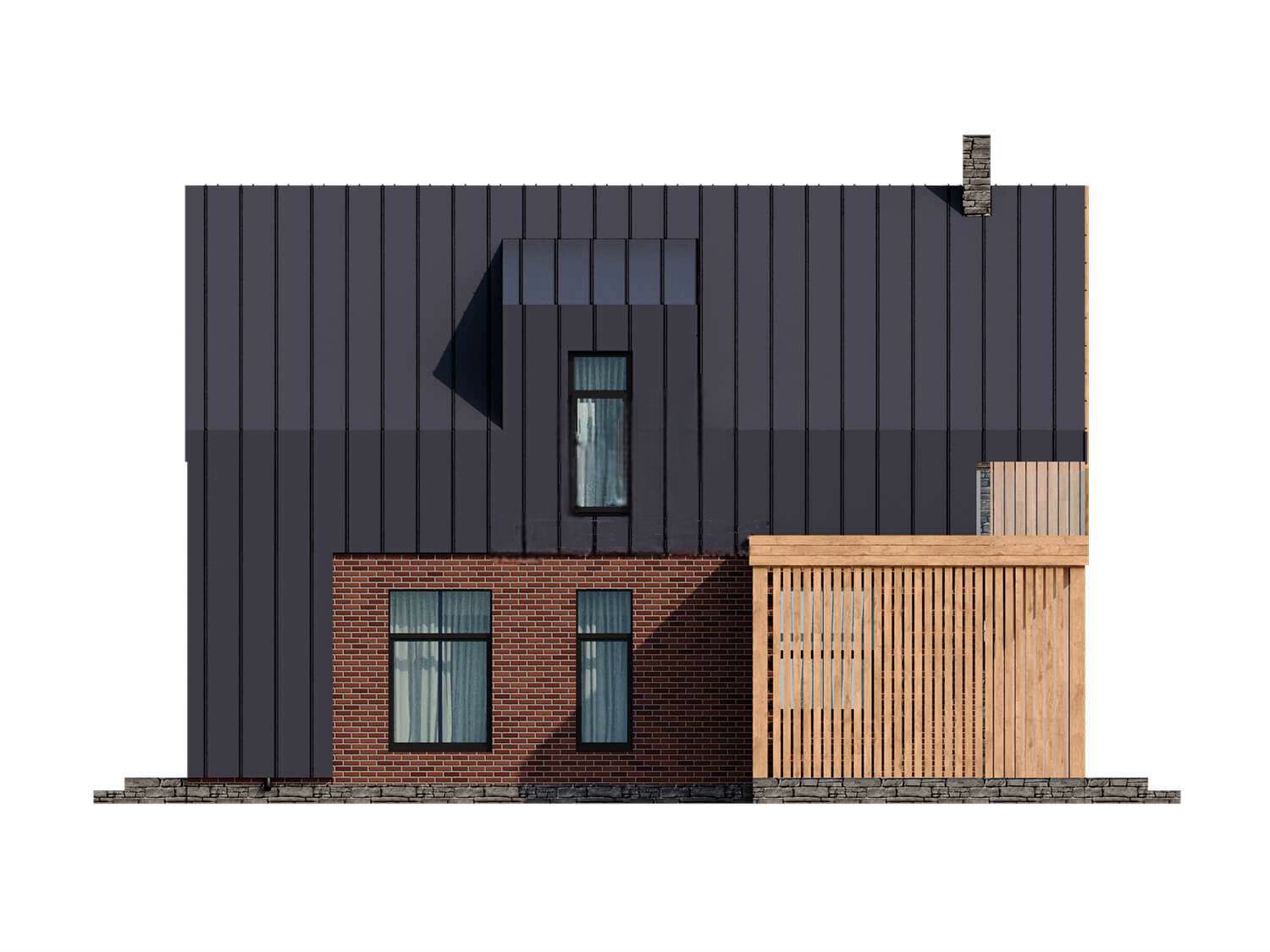 Фасад: фальцевые листы (с утеплителем 50 мм.) + термо-панели (с клинкерной плиткой) + термо-панели (натуральный камень) + дерево;