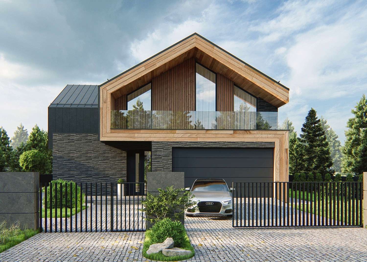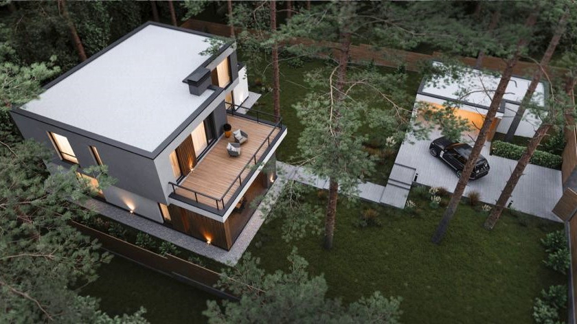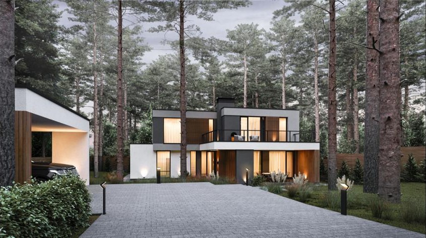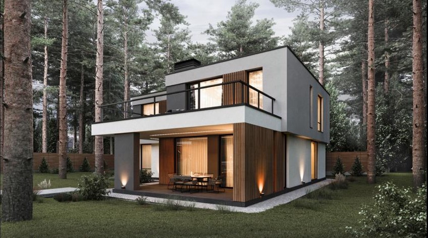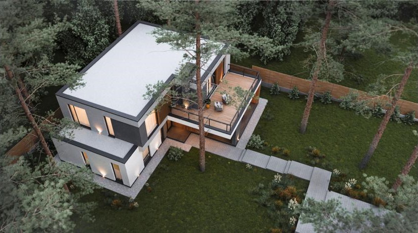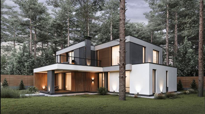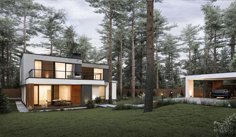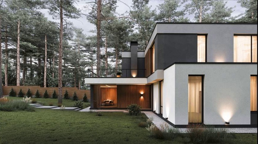 ДОМ в стиле современного минималистичного БАРНХАУСА. Первый и второй этажи имеют большое количество панорамных окон, что является одной из его главных особенностей. Фасады дома гармонично сочетают материалы: бетон, стекло, металл и дерево. Облицованный фальцем второй этаж парит над каменным контуром первого. |