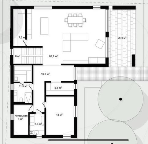 Смысловым центром дома является, 60-метровая кухня-гостиная со вторым светом, панорамным остеклением и выходом на террасу. На кухне спроектирован остров для готовки, барная зона и большой обеденный стол.