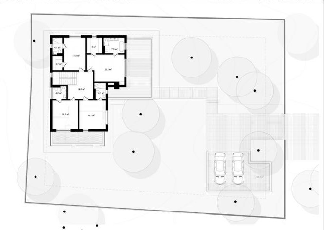 Компактный двухэтажный дом для комфортного для проживания небольшой семьи. В сочетании с архитектурой фасадов он будет уместно смотреться в любой среде, как на маленьком участке в плотном окружении домов, так и на большом участке среди природы.