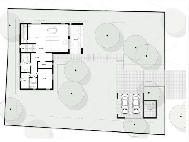На первом этаже расположена просторная гостиная с открытой кухней и панорамным остеклением имеющая собственный выход террасу, спальня, холл с санузлом, котельная и прихожая с крыльцом.