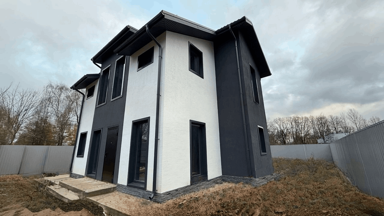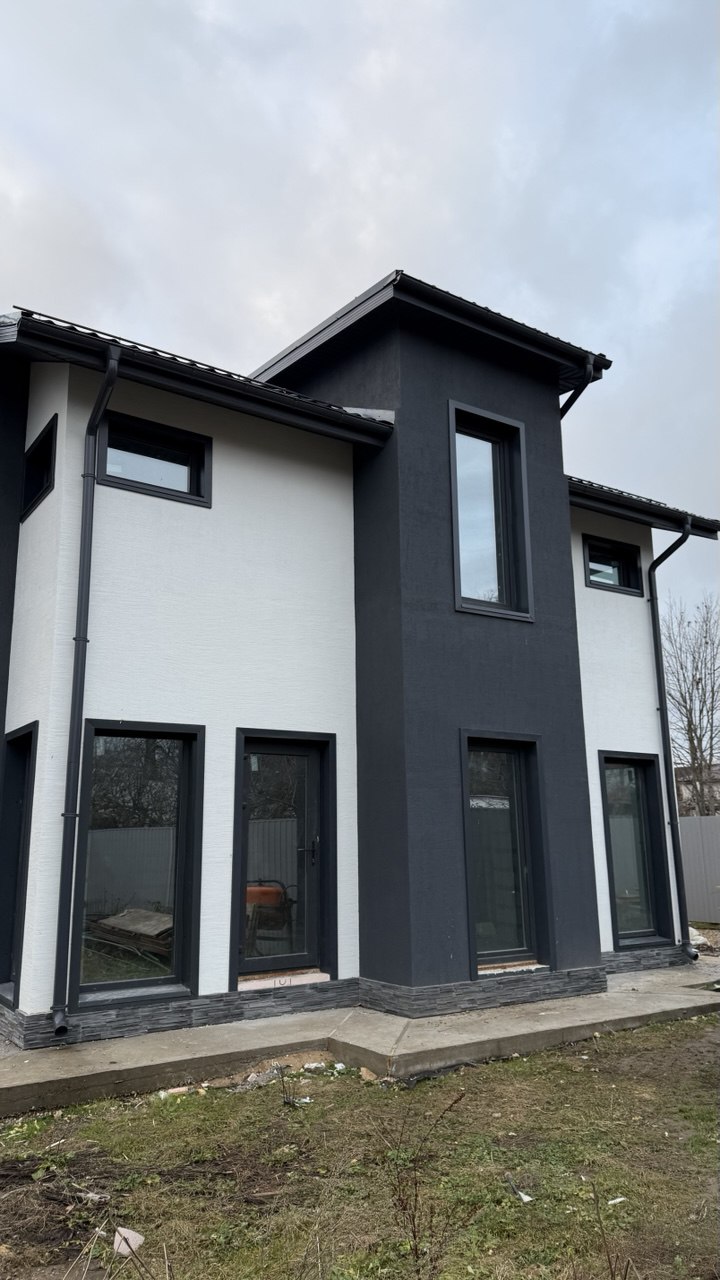 Фасад: утепление ПП 50мм + фасадная штукатурка цвет белый и графит;